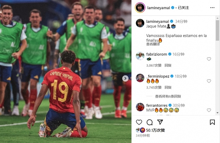 随后在那场欧洲杯半决赛中,亚马尔一记世界波颜射拉比奥特,帮助西班牙2-1战胜法国。亚马尔赛后也对着镜头大喊“现在说话!现在说话!”